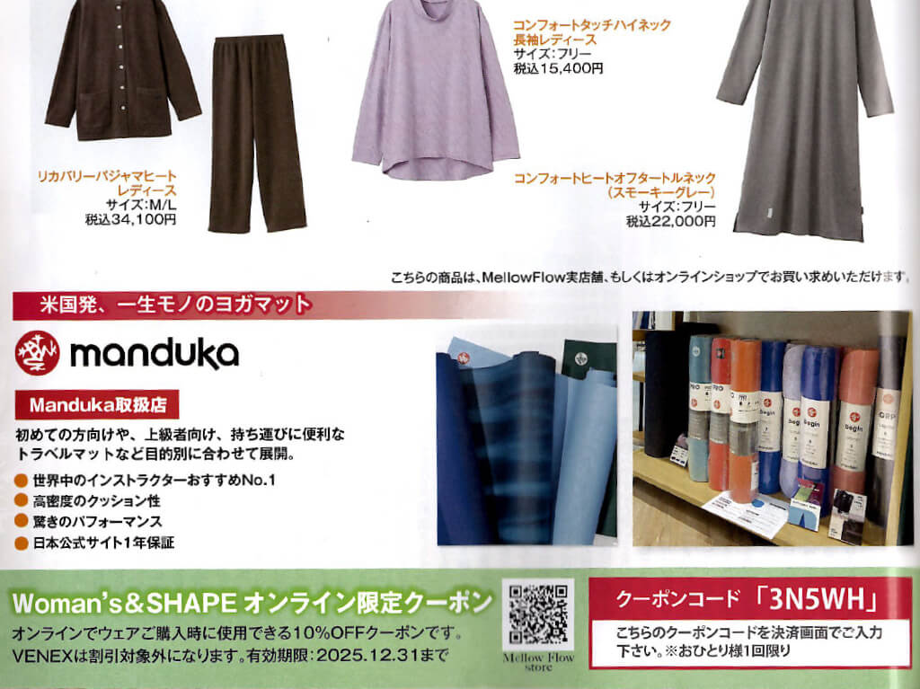 【メディア掲載情報】Yoga&Fitness 12月号 2025 12/28 メディア掲載 25/12/28皆様こんにちは!「Yoga&Fitness 12月号」にてPuravidaアイテムが掲載されましたので、ご紹介いたします!【掲載商品】mandukaP.87Manduka ヨガマット メディア掲載